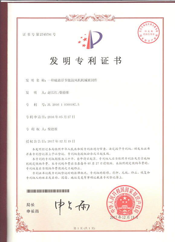 一種磁懸浮節(jié)能鼓風機機械密封件發(fā)明專利證書